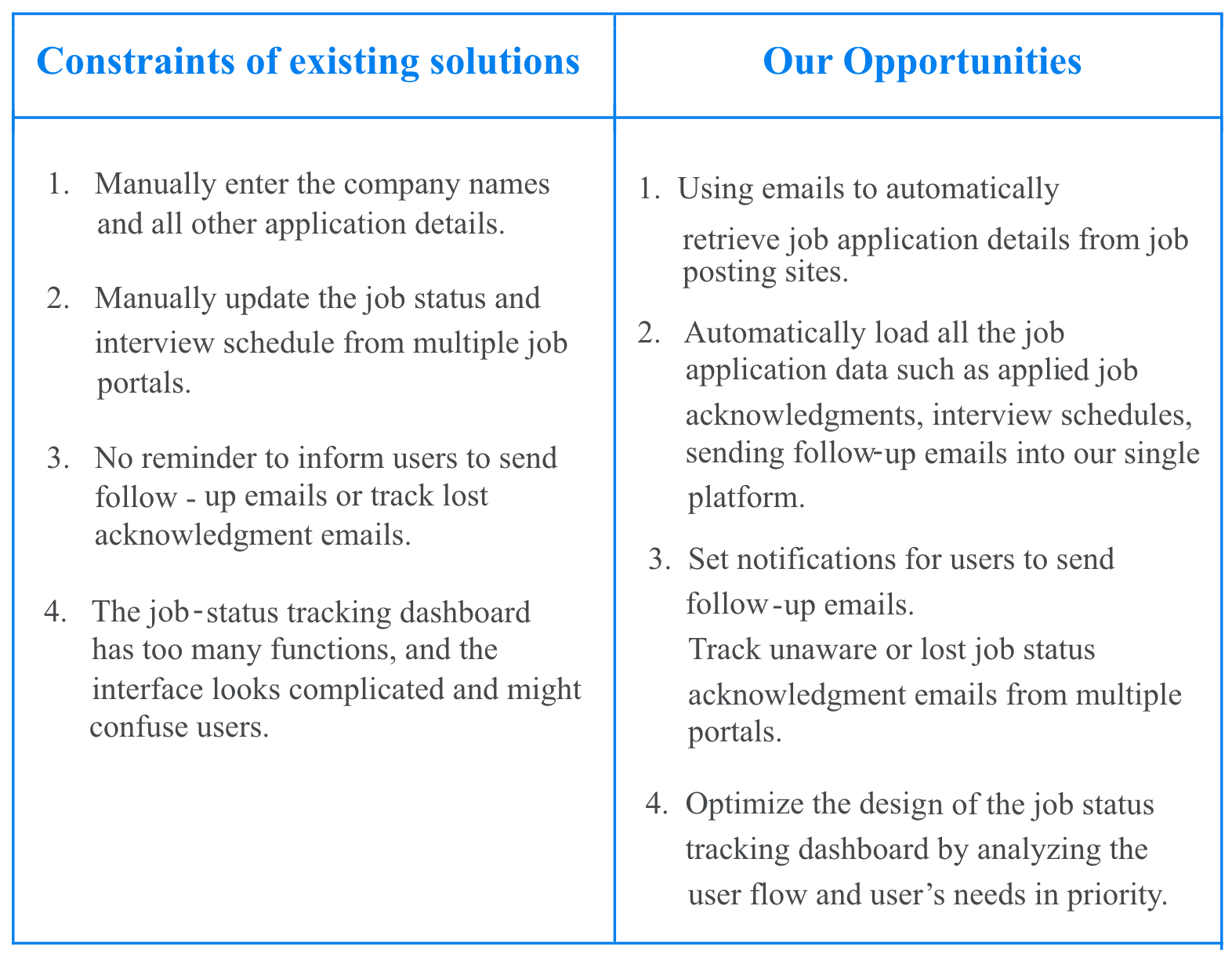We did competitive research to learn about the existing solutions that help job seekers to track their applications.We acknowledged that our participants used notebooks, spreadsheets, and note-taking applications to organize, and track their job applications. Our second round of competitive analysis led us to identify that the applications that exist to manage job applications require user’s manual input. This implies that a job seeker has to spend a certain amount of time to manage their job applications.